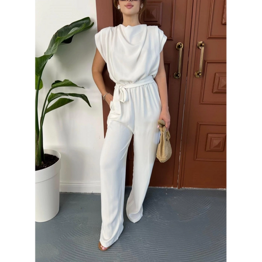 Omuz Vatkalı Bel Kuşaklı Premium Tulum Beyaz