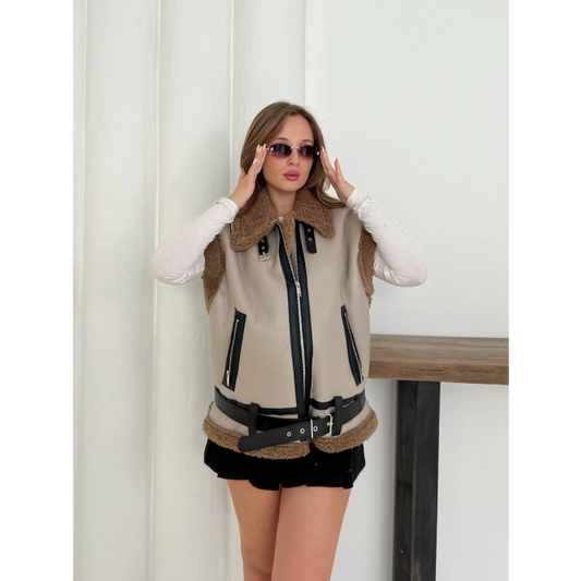 Peluşlu Yaka Kemer Detaylı Ceket Bej