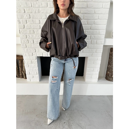 Alt Kemer Detaylı Tasarım Deri Ceket Kahverengi