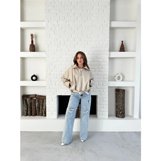 3 AL 2 ÖDEAlt Kemer Detaylı Tasarım Deri Ceket Krem