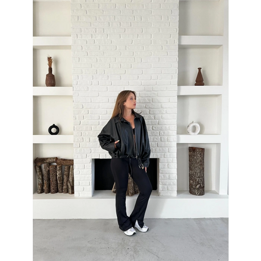 3 AL 2 ÖDEAlt Kemer Detaylı Tasarım Deri Ceket Siyah