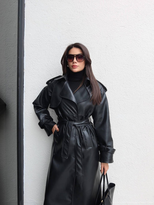 3 AL 2 ÖDEApolet Detay Kuşaklı Deri Trench Siyah