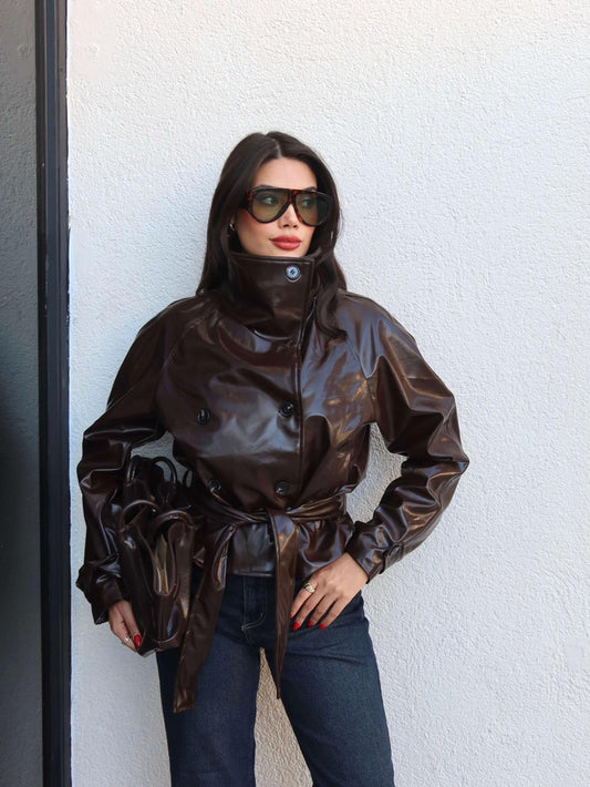 3 AL 2 ÖDEBelden Bağlamalı Rugan Ceket Kahverengi