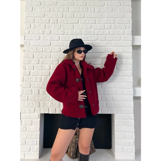 Düğme Detay Teddy Oversize Ceket Bordo