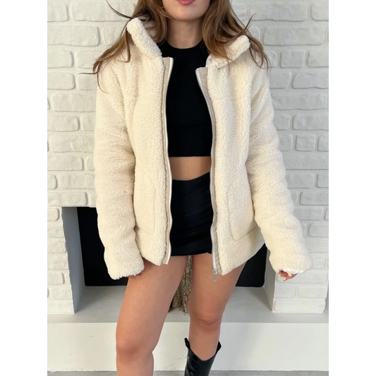 Fermuarlı Cep Detaylı Peluş Ceket Krem