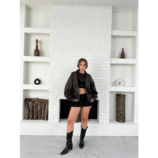 Çıtçıt Detaylı Tasarım Bomber Deri Ceket Kahverengi