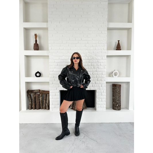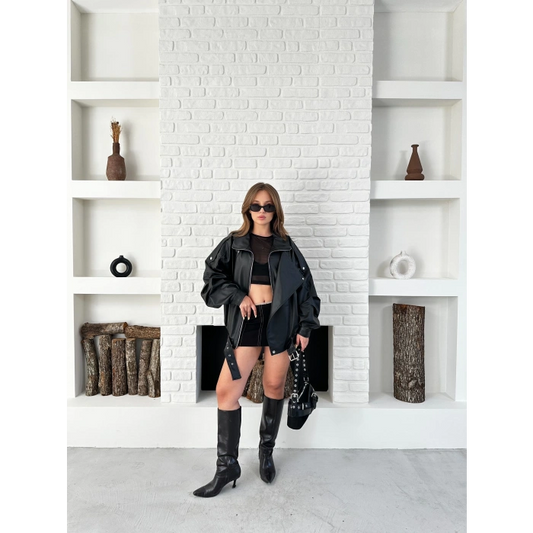 3 AL 2 ÖDEKemerli Ön Tasarım Deri Ceket Siyah