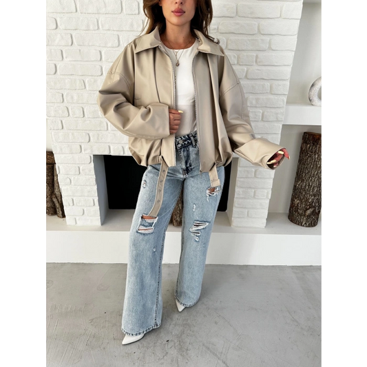 Alt Kemer Detaylı Tasarım Deri Ceket Krem