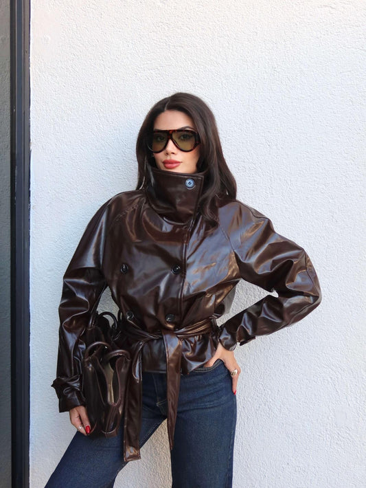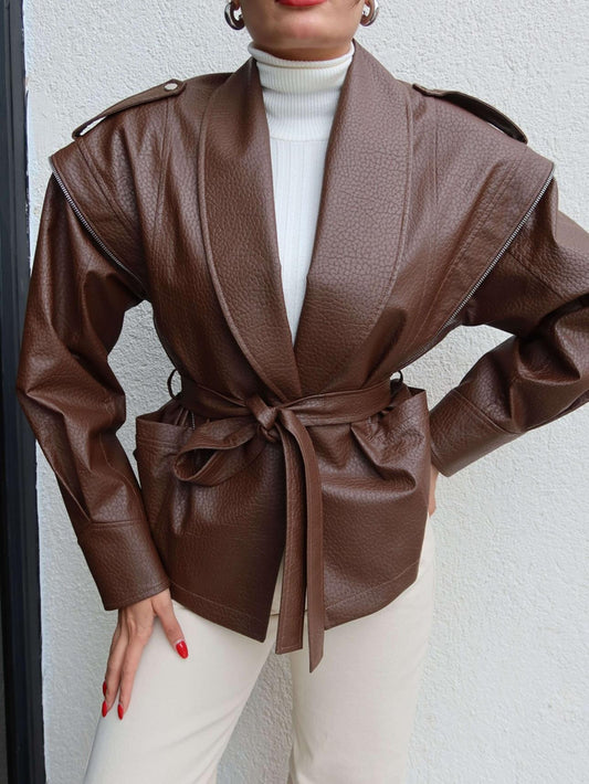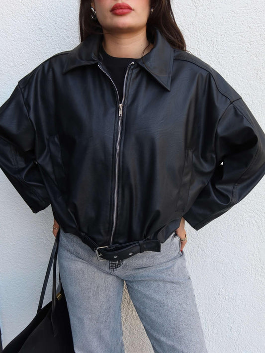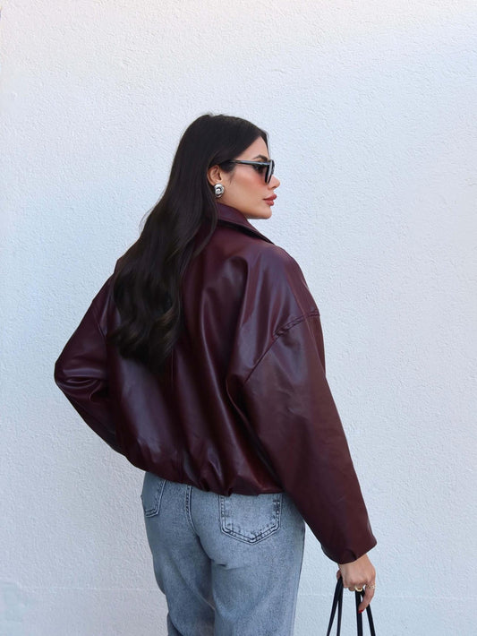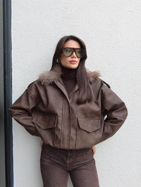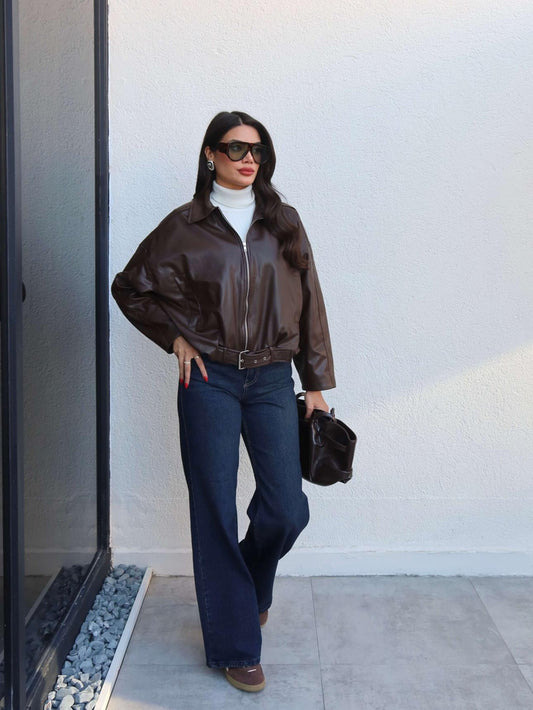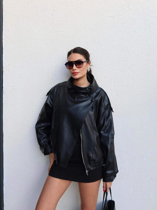 Dik Yaka Kruvaze Bomber Deri Ceket