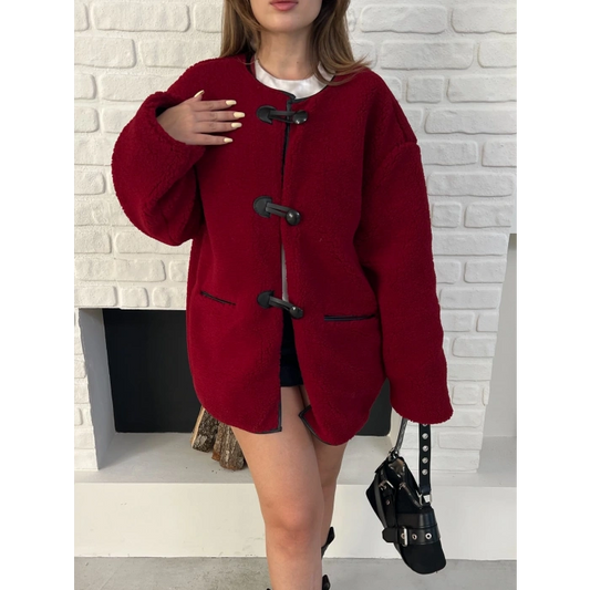 Düğme Detay Teddy Oversize Ceket Bordo