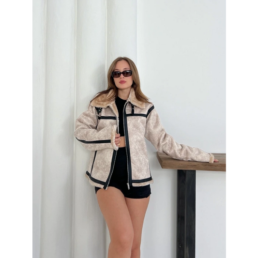 Fermuarlı Cep Detaylı Peluş Ceket Krem