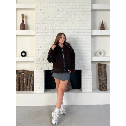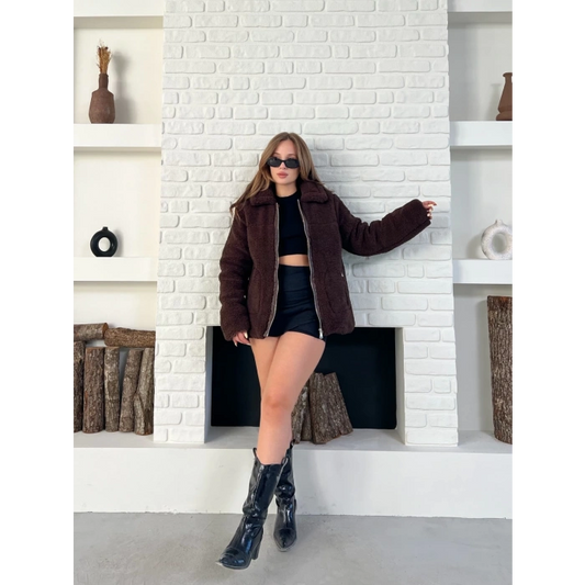 3 AL 2 ÖDEFermuarlı Cep Detaylı Peluş Ceket Kahverengi