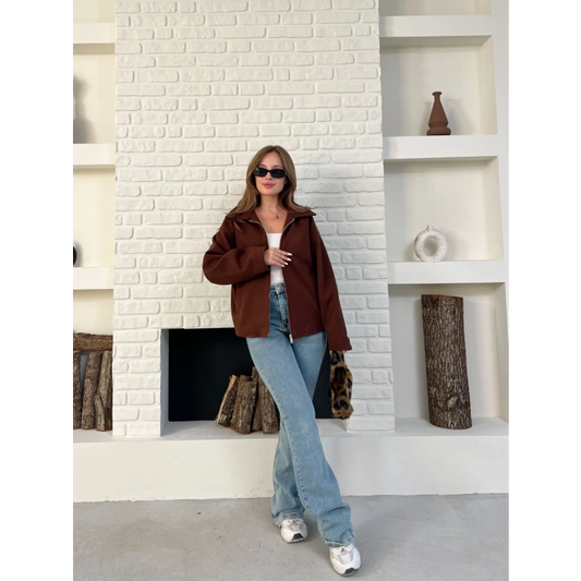3 AL 2 ÖDEFermuarlı Kaşe Kısa Ceket Kahverengi