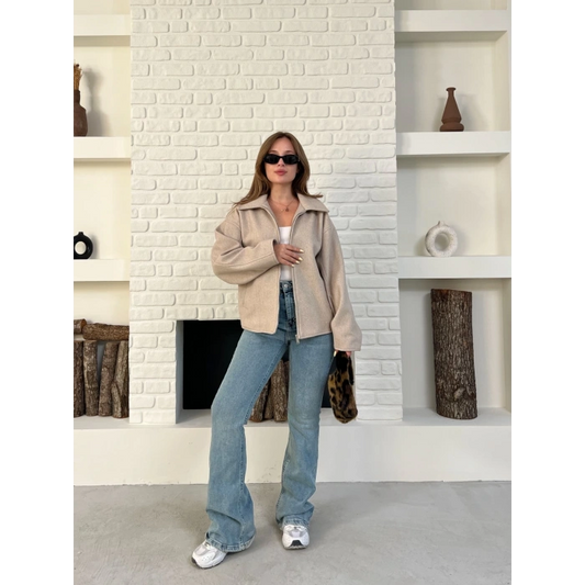 3 AL 2 ÖDEFermuarlı Kaşe Kısa Ceket Krem