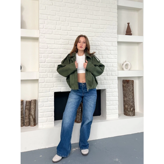3 AL 2 ÖDEYaka Peluş Detay Deri Ceket Yeşil