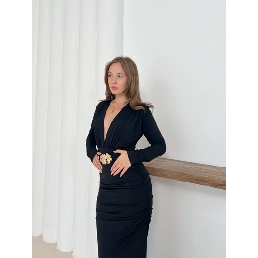 Aksesuarlı Büzgü Detaylı Elbise Siyah
