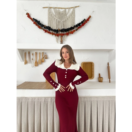 Aksesuarlı Büzgü Detaylı Elbise Bordo