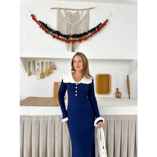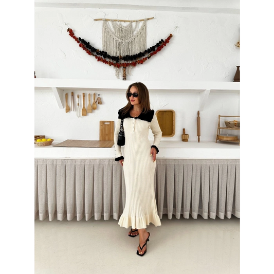 Boyundan Bağlamalı Örgü Detaylı Uzun Elbise Beyaz