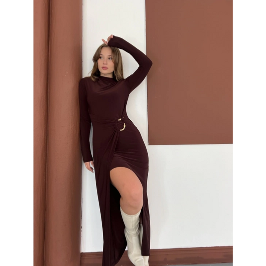Toka Detaylı Yırtmaçlı Sandy Elbise Acı Kahve