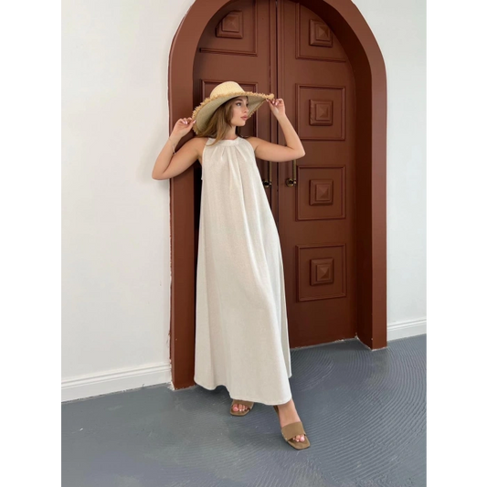 Ayarlanabilir Askılı Keten Elbise Beyaz