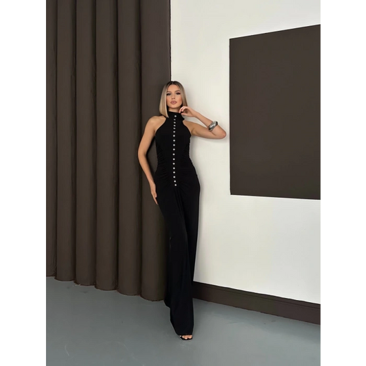 Düğme Detaylı C Yaka Uzun Elbise Siyah
