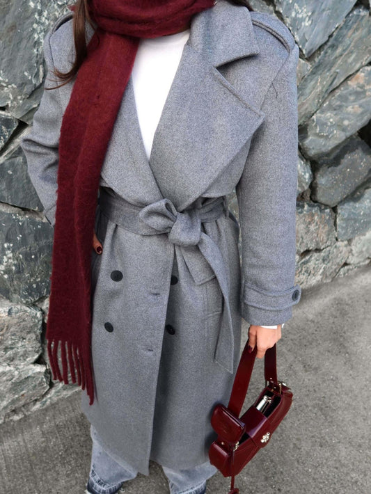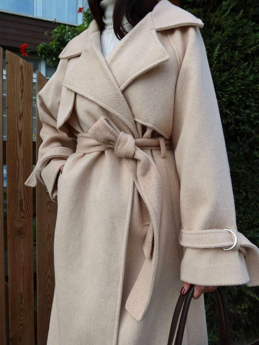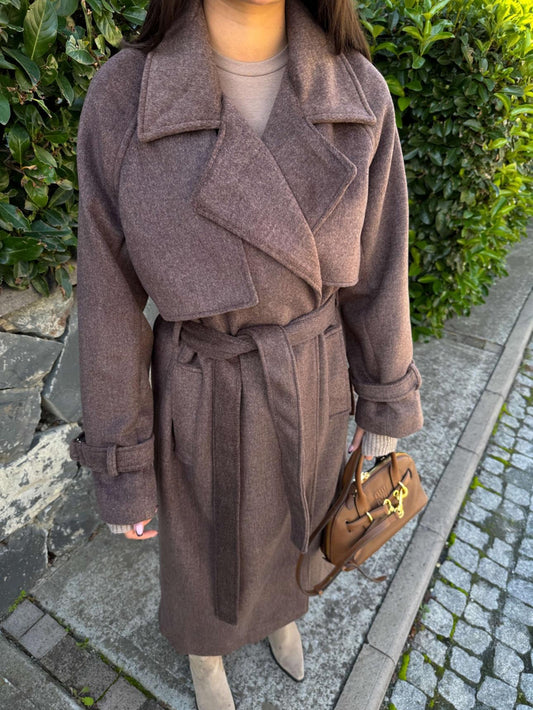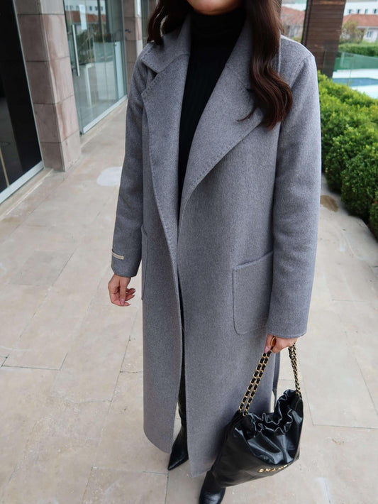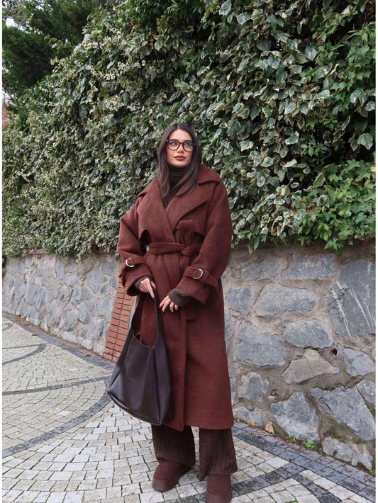 Kruvaze Kol Kemerli Kuşaklı Yün Kaban