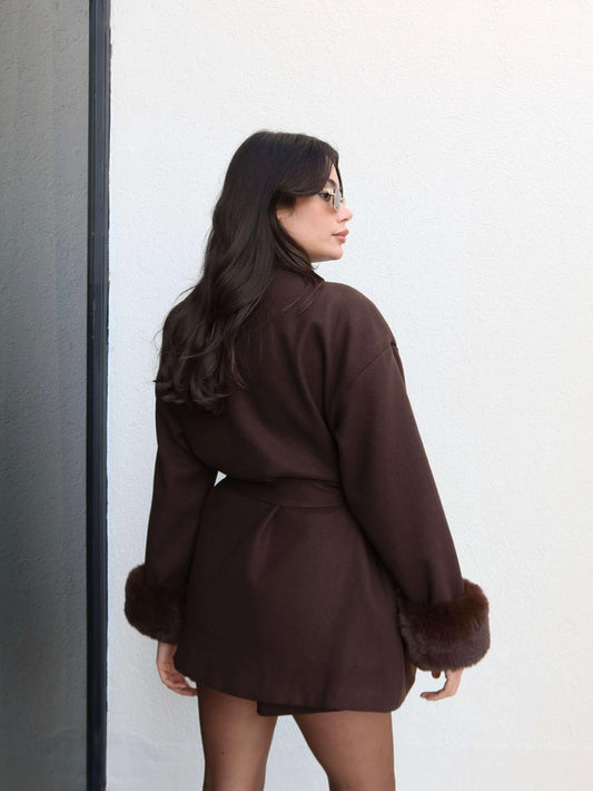 Kürk Manşetli Bağlamalı Kısa Kaban