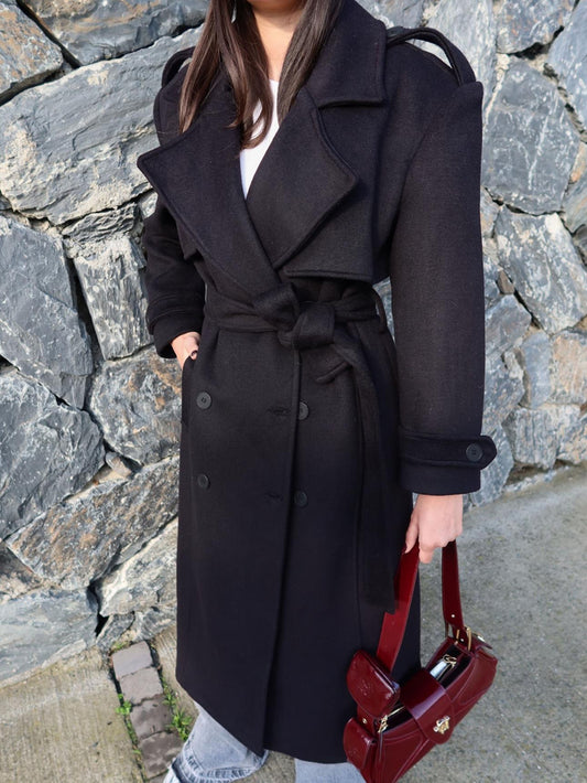 Kruvaze Yaka Parça Detay Apoletli Kuşaklı Kaban