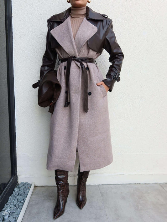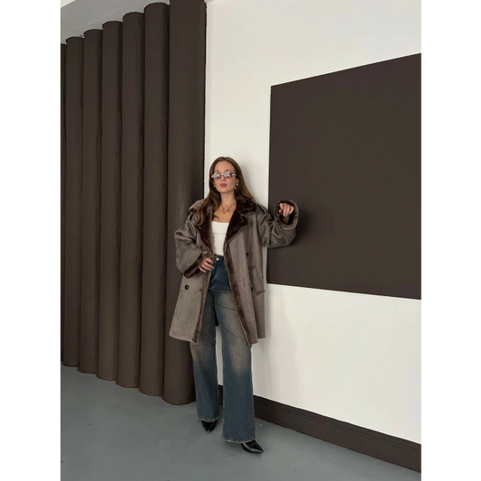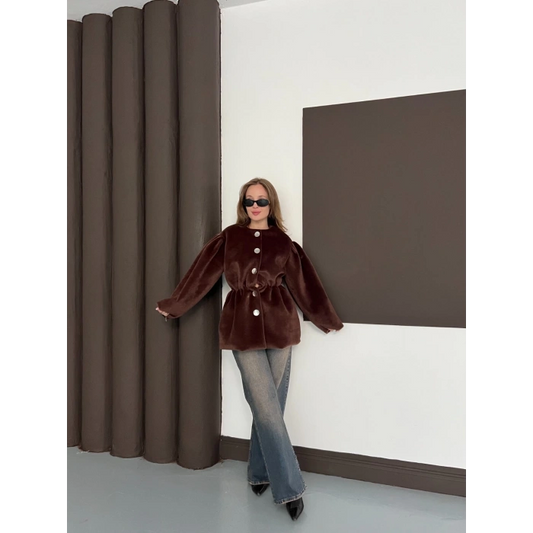3 AL 2 ÖDEPeluş Detaylı Uzun Lamine Kaban Kahve