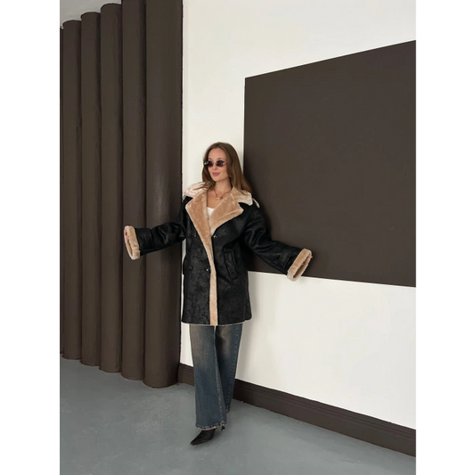 3 AL 2 ÖDEPeluş Detaylı Uzun Lamine Kaban Siyah Bej