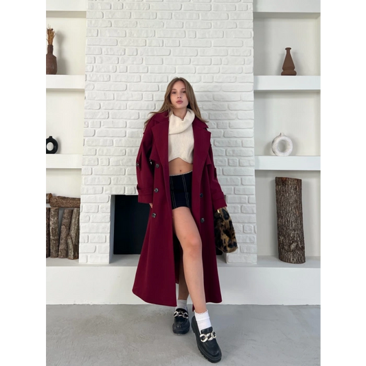 3 AL 2 ÖDEUzun Boy Kuşak Detaylı Kaban Bordo