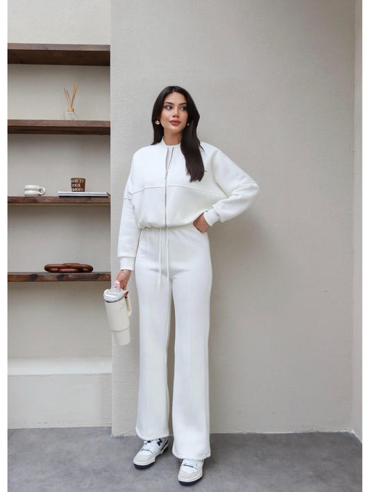 Çimalı Fermuar Detay Şardonlu Eşofman Takım Beyaz