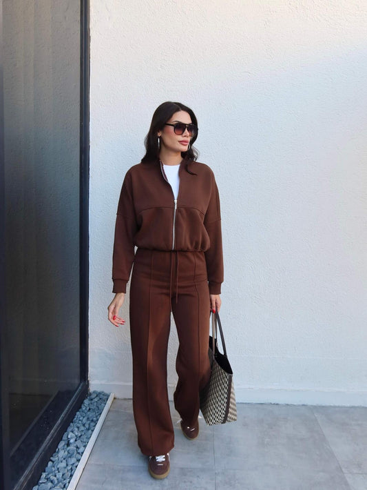 Çimalı Fermuar Detay Şardonlu Eşofman Takım Kahve