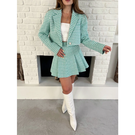 Kaz Ayağı Desen Pliseli Etek Crop Ceket Takım Mint