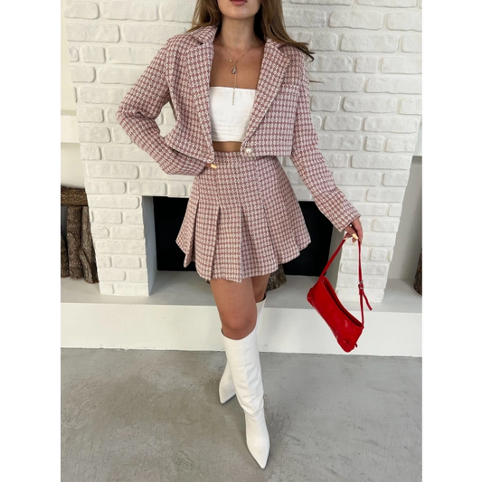 Kaz Ayağı Desen Pliseli Etek Crop Ceket Takım Pembe