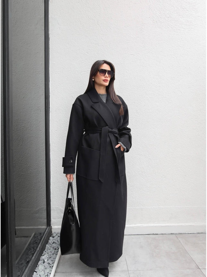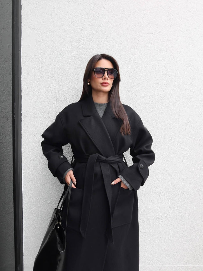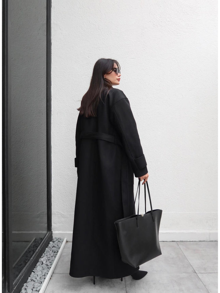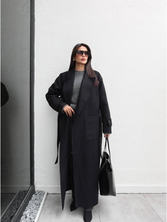 Açık Cep Apolet Detay Kuşaklı Kaban Siyah