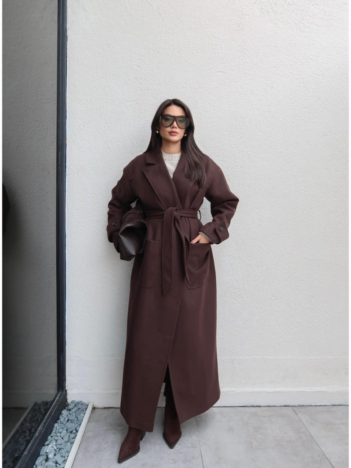 Açık Cep Apolet Detay Kuşaklı Kaban Kahve