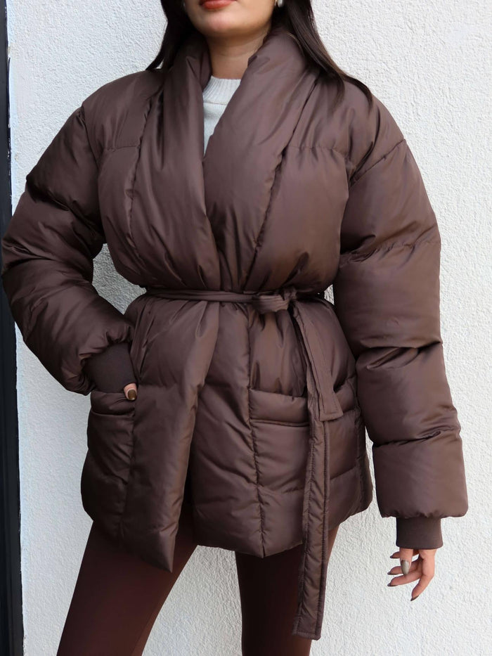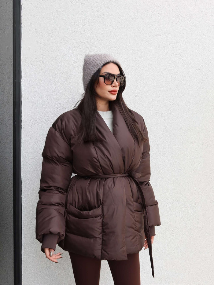 Açık Cep Ön Bağlamalı Şişme Mont Kahve