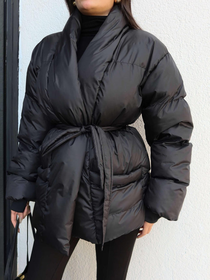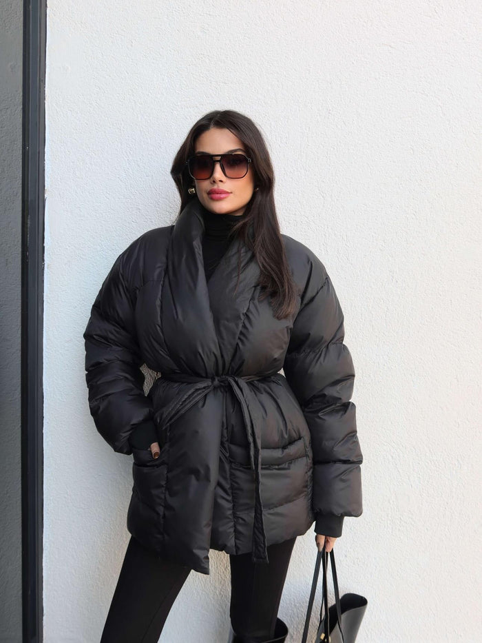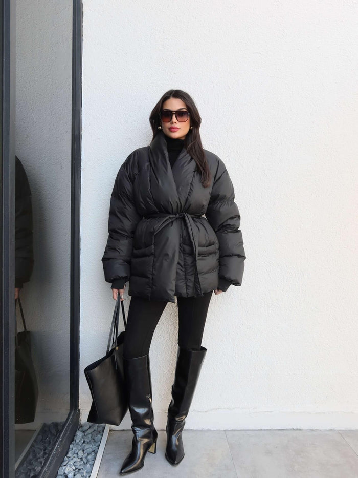 Açık Cep Ön Bağlamalı Şişme Mont Siyah