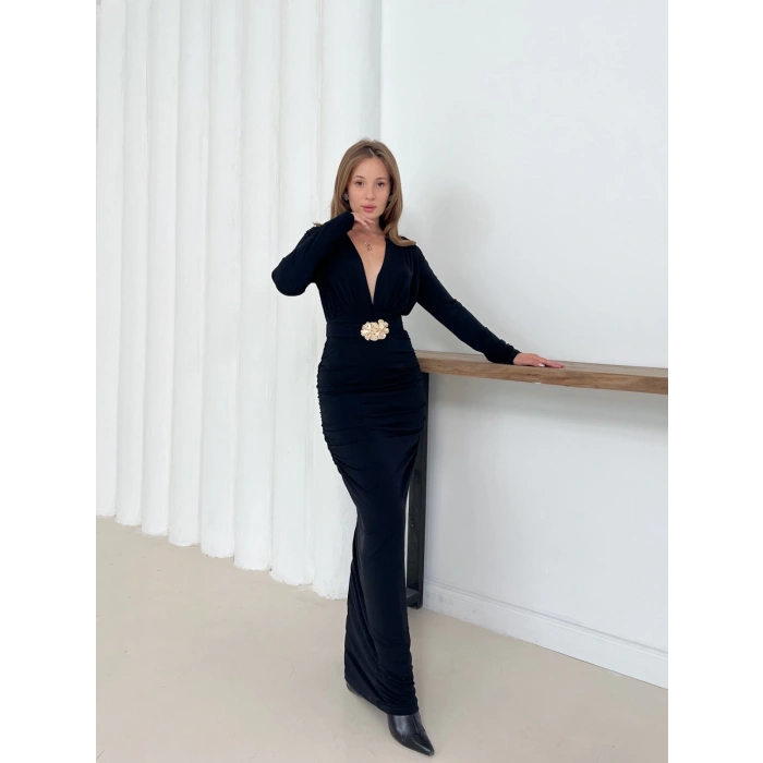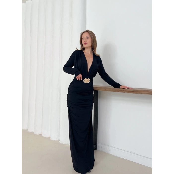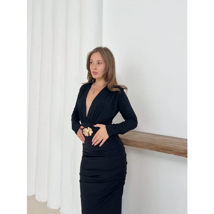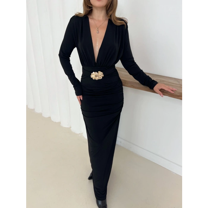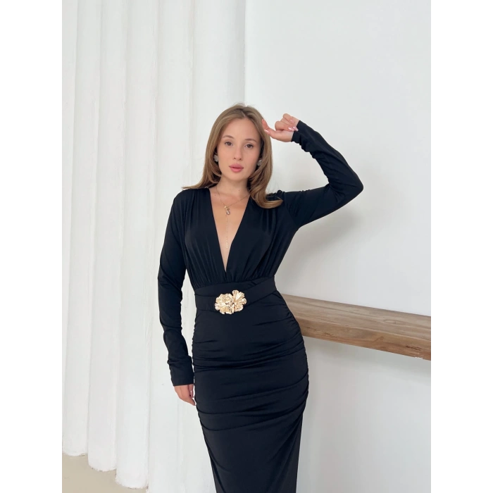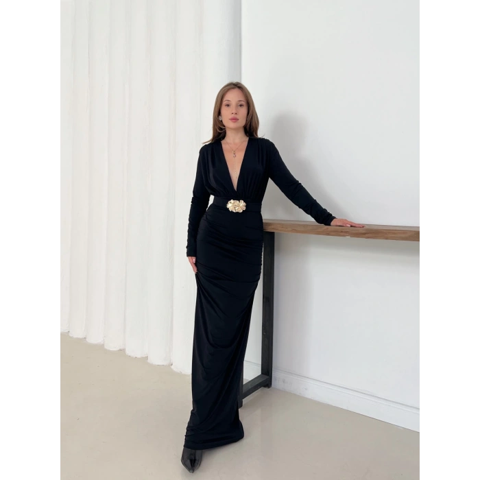 Aksesuar Detaylı Dekolte Sandy Elbise Siyah