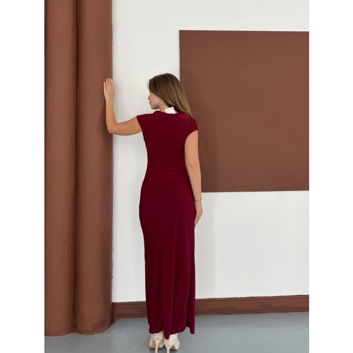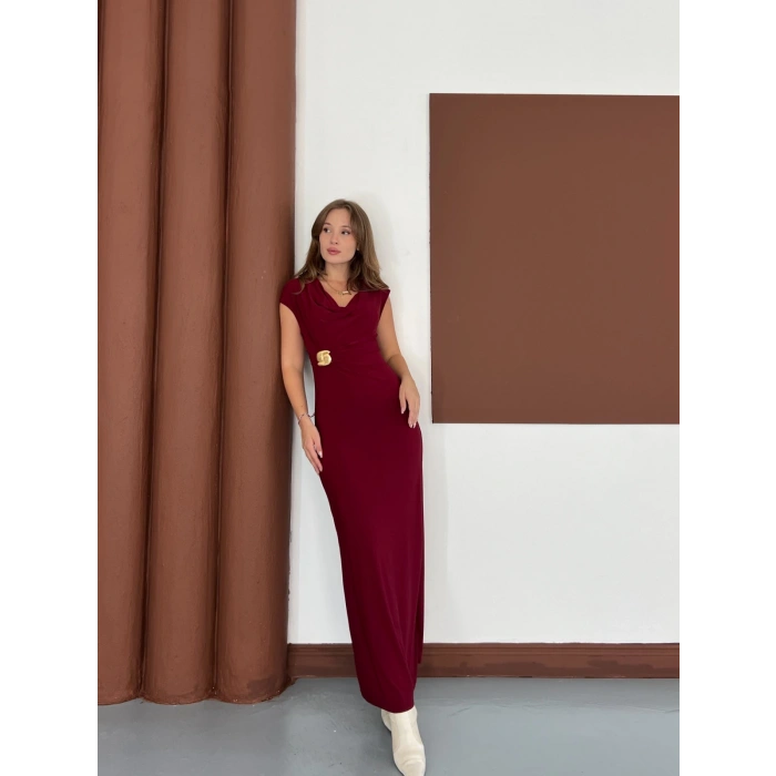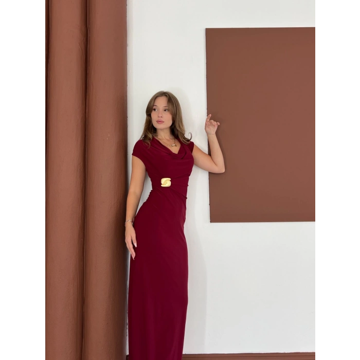 Aksesuarlı Büzgü Detaylı Elbise Bordo