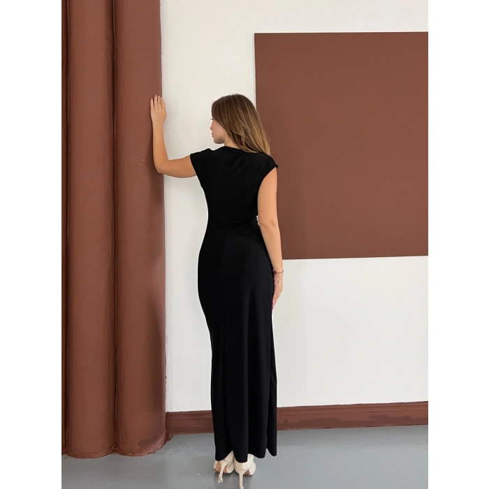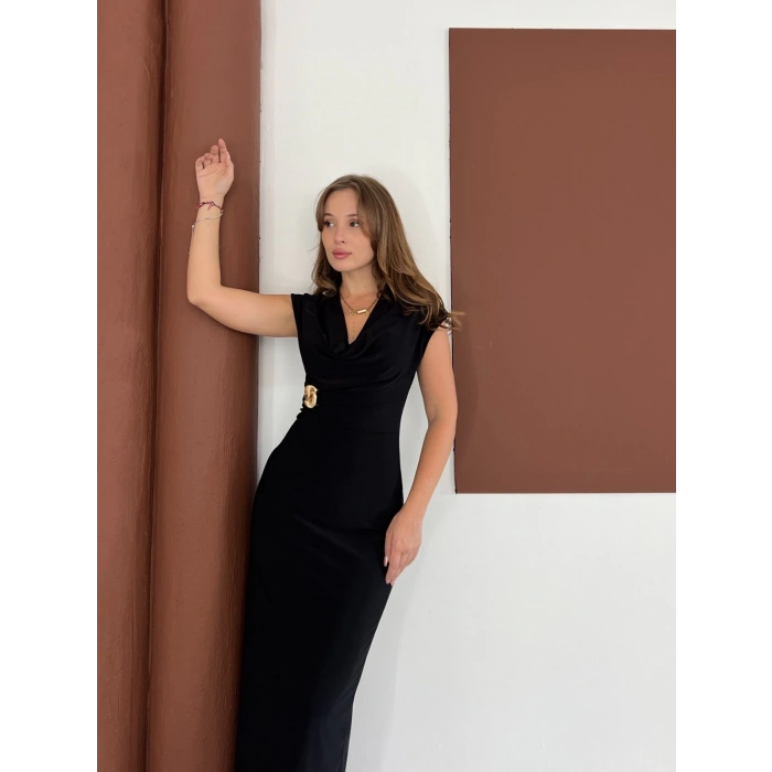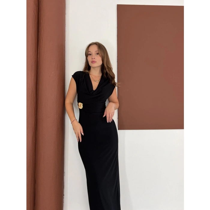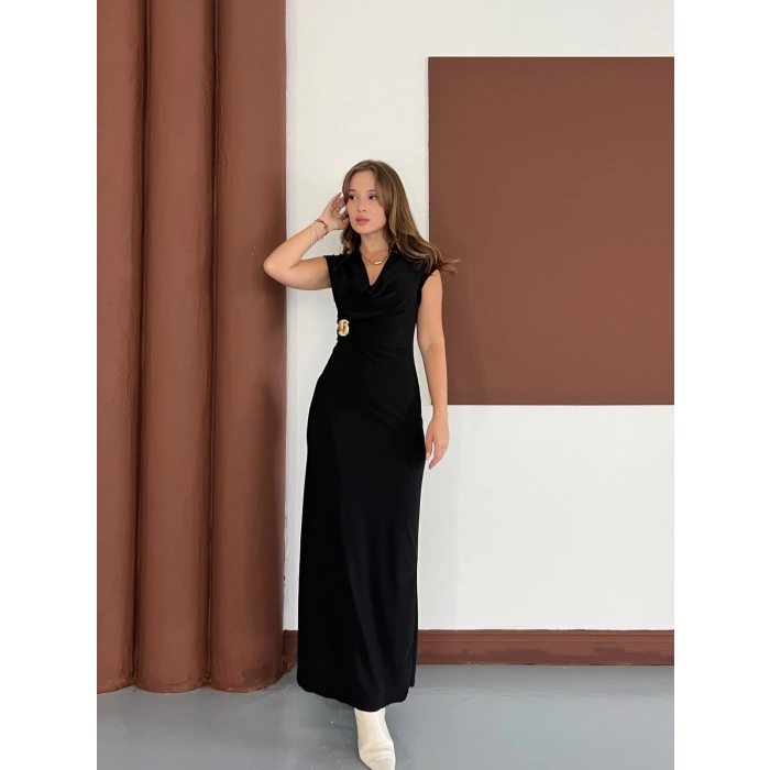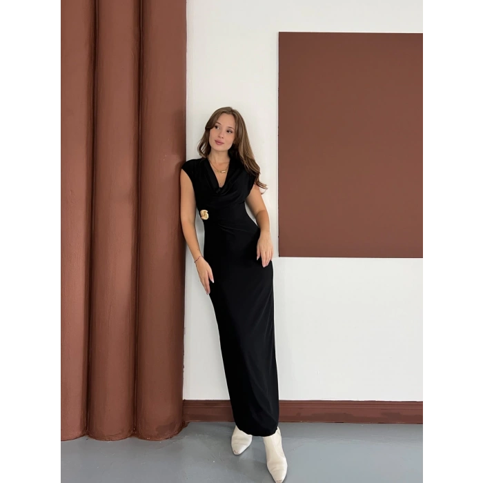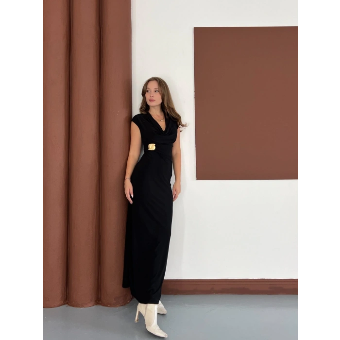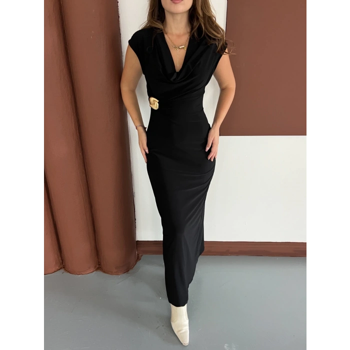 Aksesuarlı Büzgü Detaylı Elbise Siyah