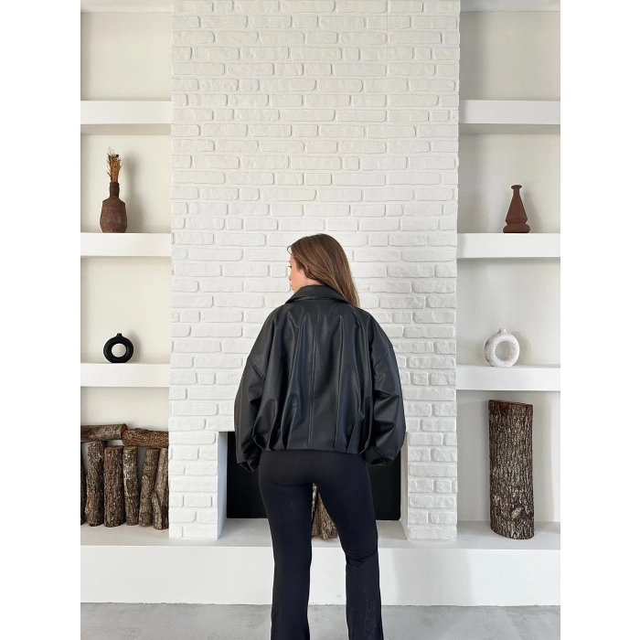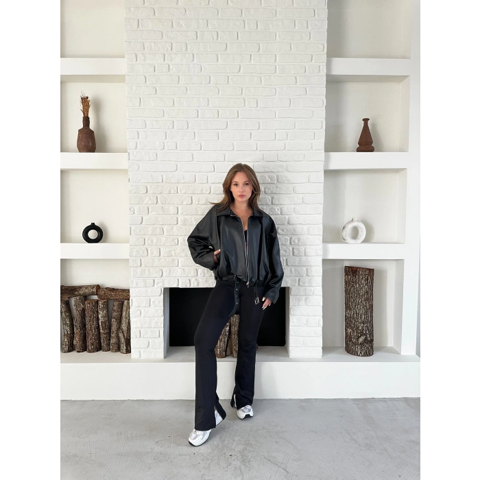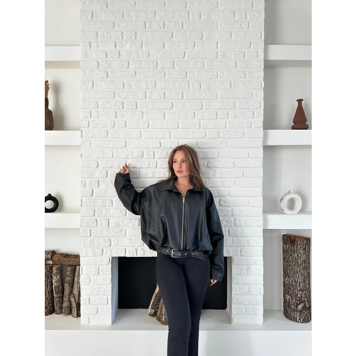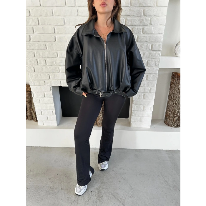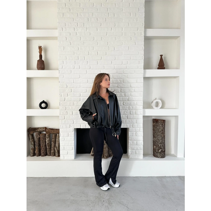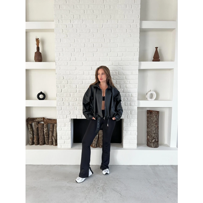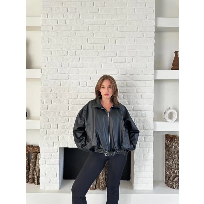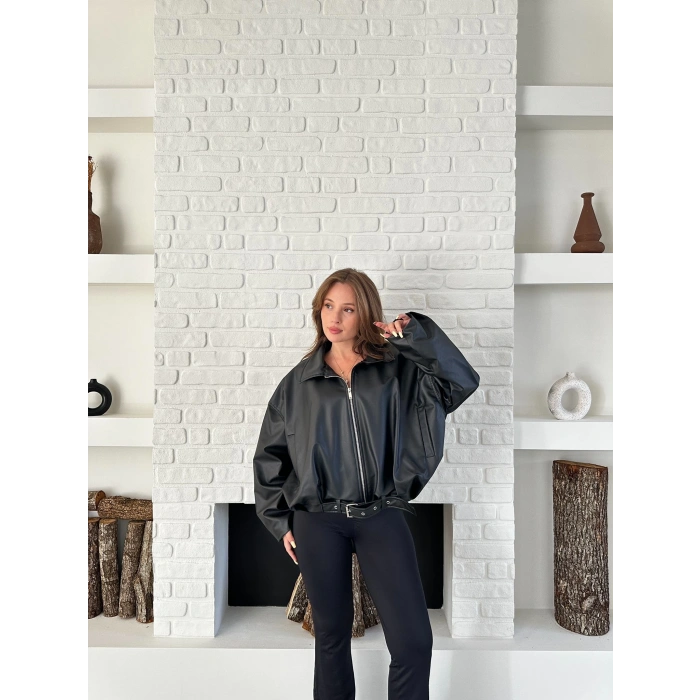 Alt Kemer Detaylı Tasarım Deri Ceket Siyah