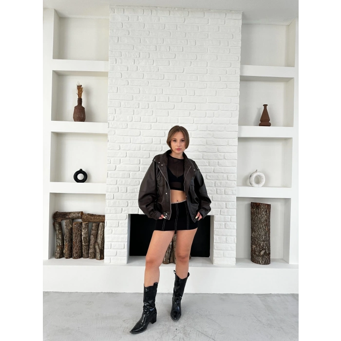 Bel Lastikli Çıtçıtlı Deri Bomber Ceket Kahverengi