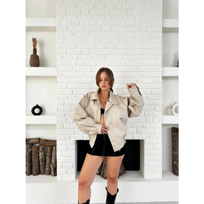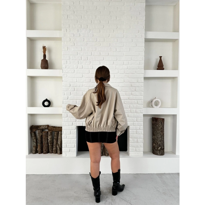 Bel Lastikli Çıtçıtlı Deri Bomber Ceket Krem