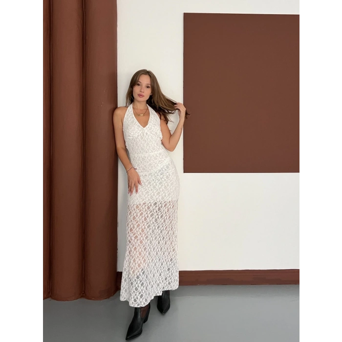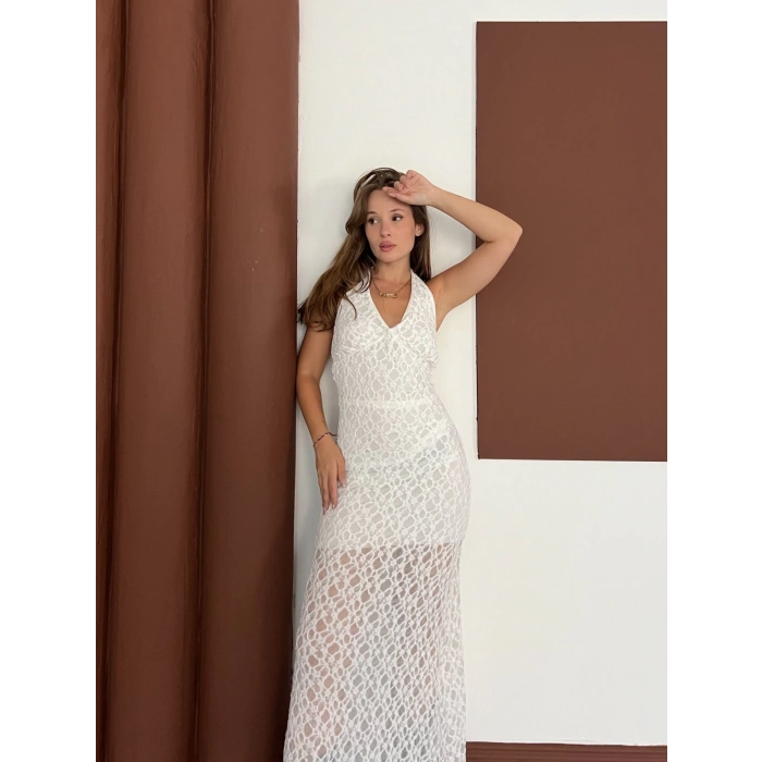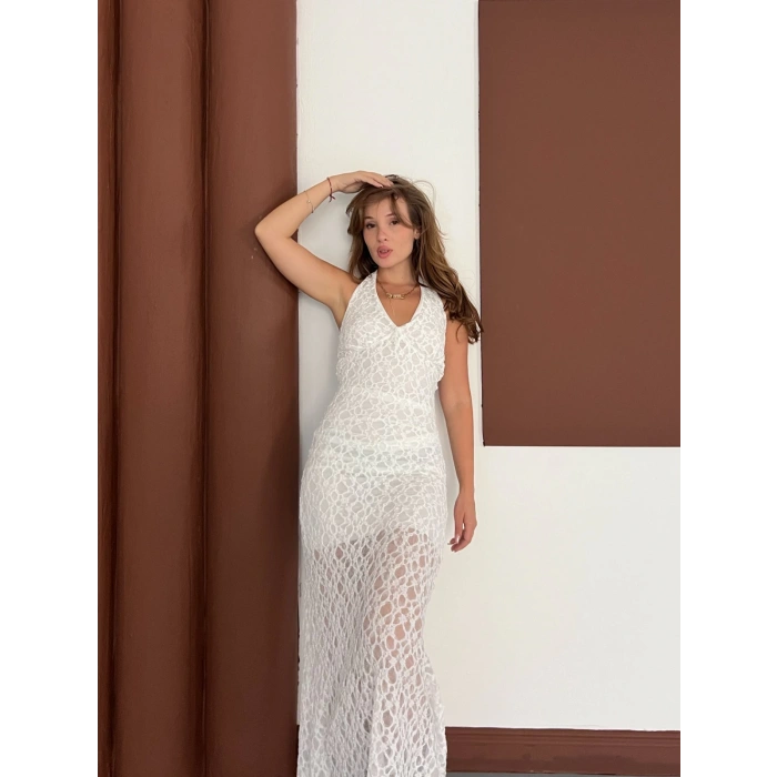 Boyundan Bağlamalı Örgü Detaylı Uzun Elbise Beyaz
