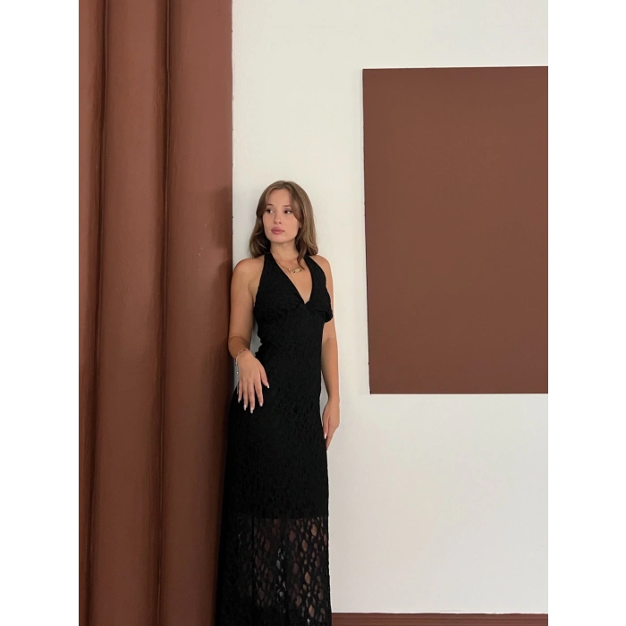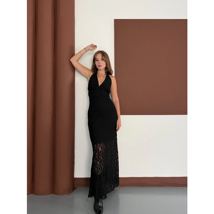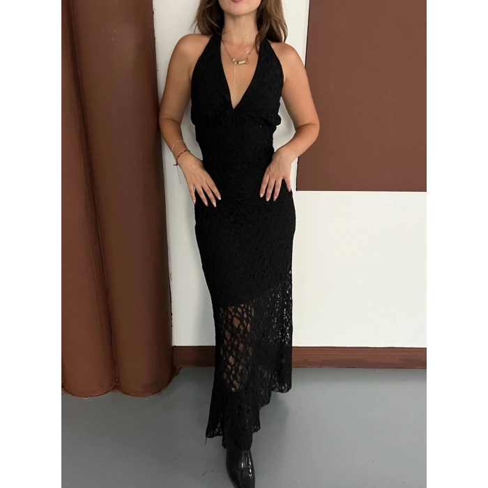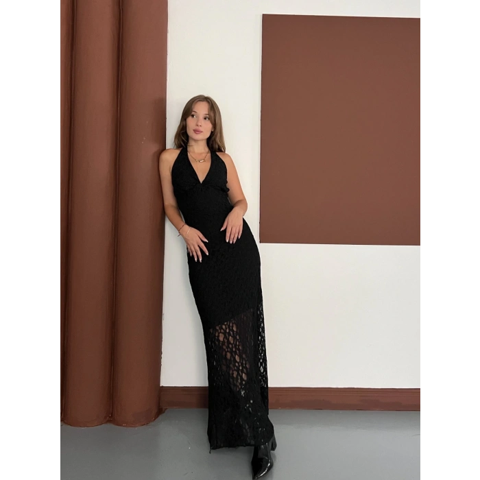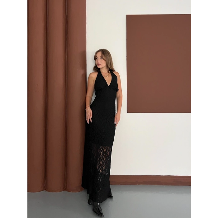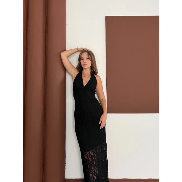 Boyundan Bağlamalı Örgü Detaylı Uzun Elbise Siyah