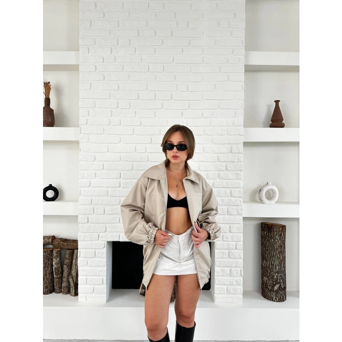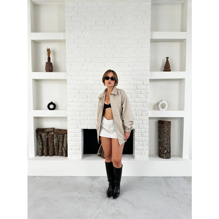 Cep Detaylı Uzun Bomber Ceket Krem