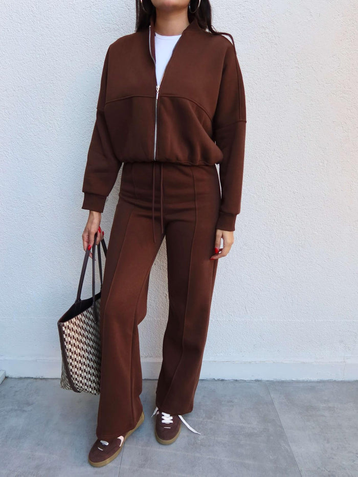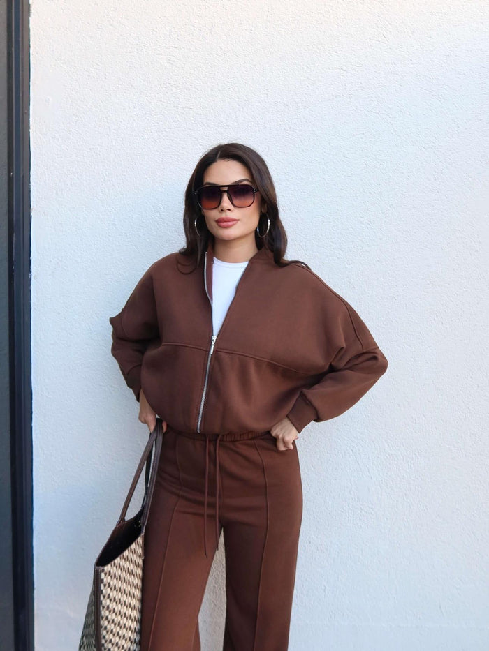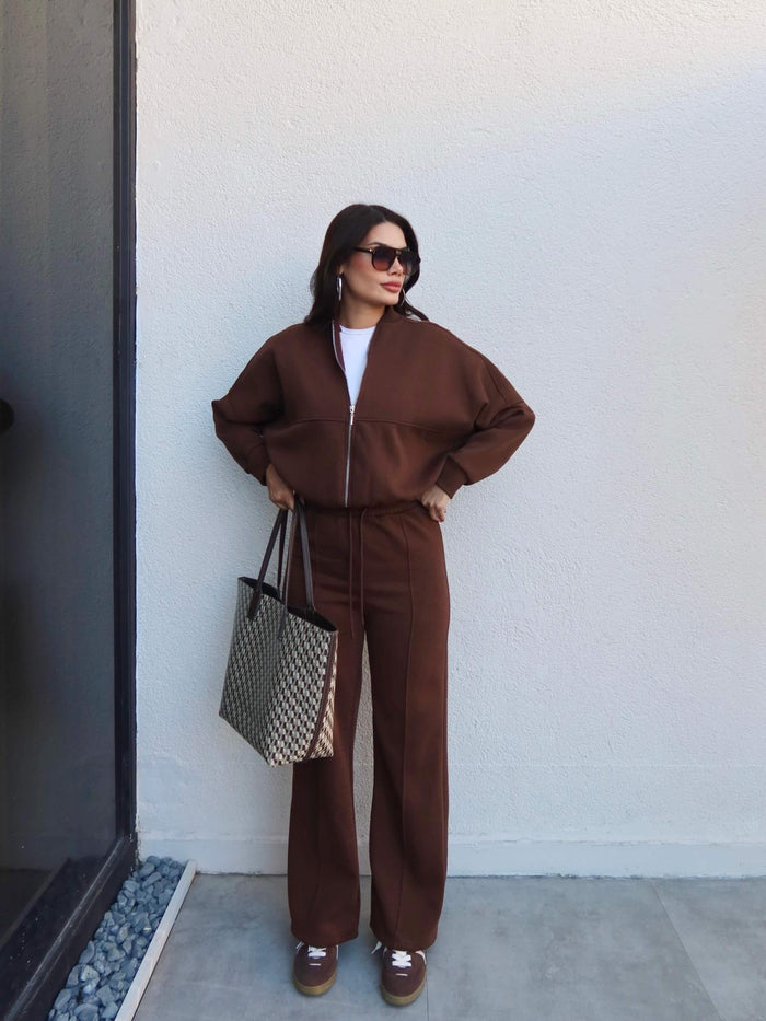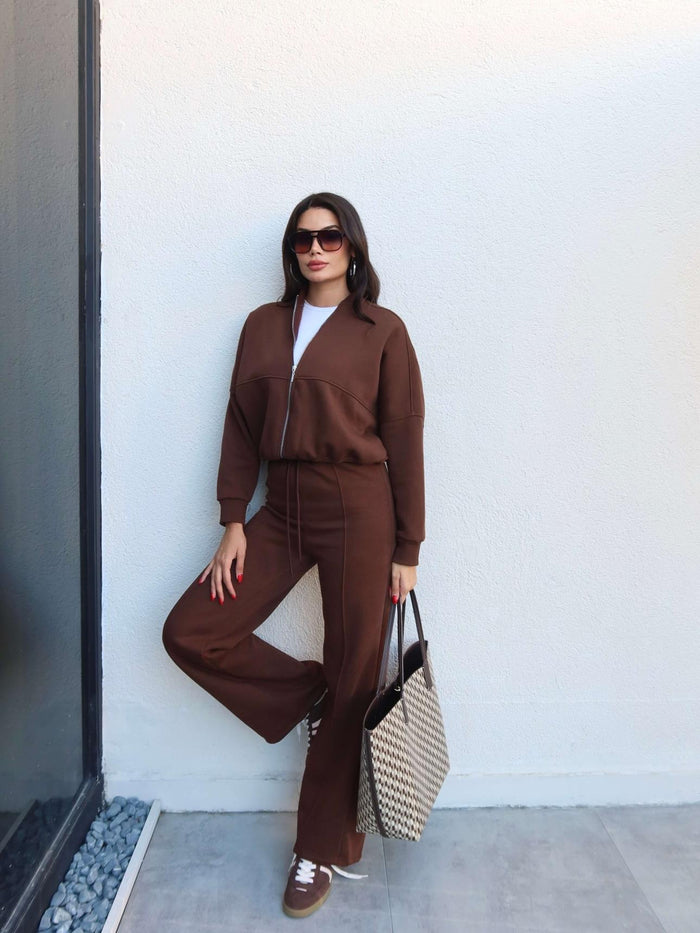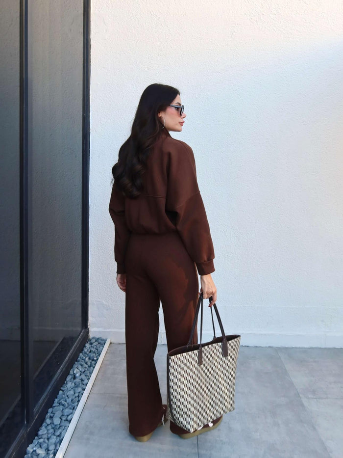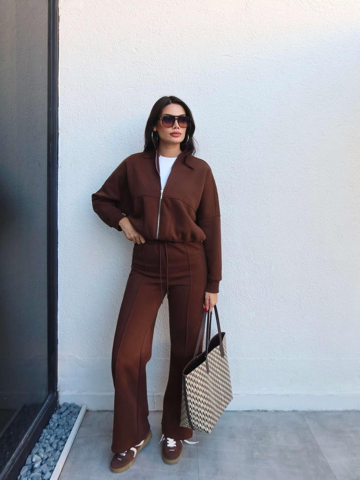 Çimalı Fermuar Detay Şardonlu Eşofman Takım Kahve