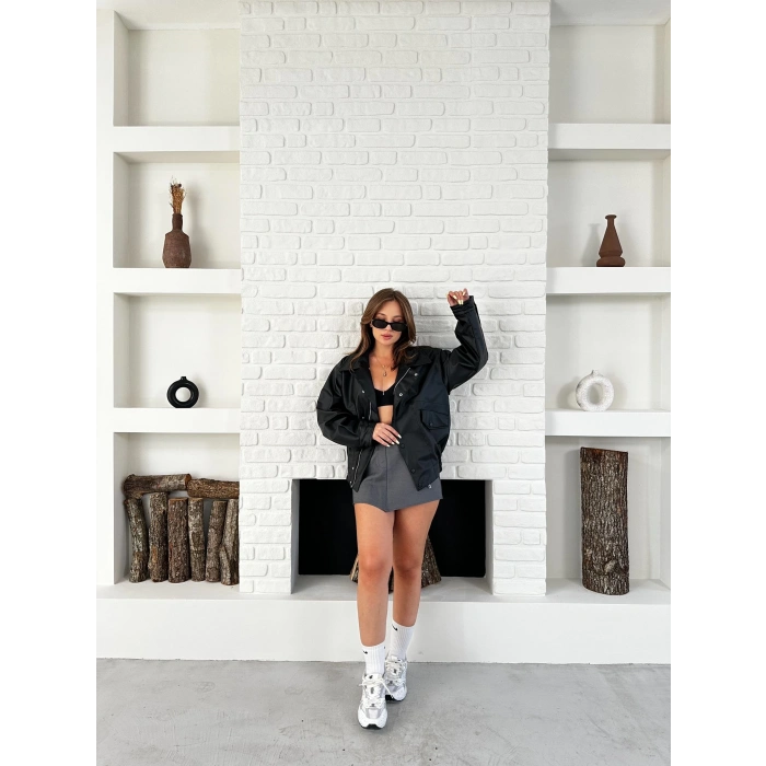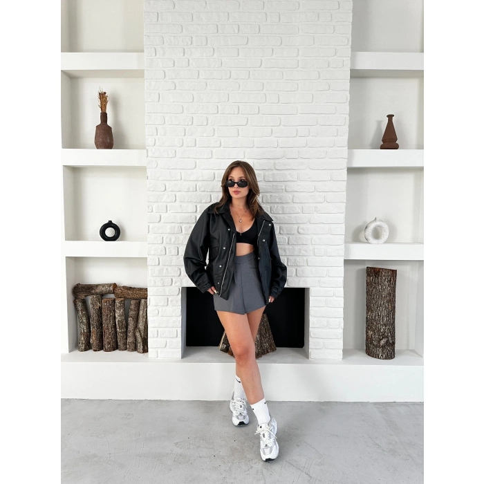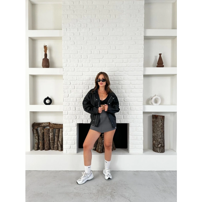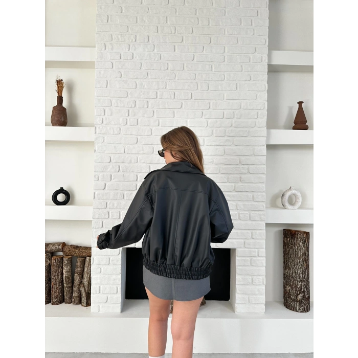 Çıtçıt Detaylı Tasarım Bomber Deri Ceket Siyah